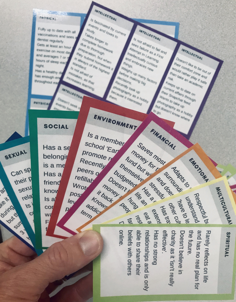 Another amazing activity that can be used to teach the Dimensions of Health is Andrew Milne’s @carmelhealth Dimensions of Wellness card game which can be found on his #slowchathealth blog. “Students deal out cards that represent the 10 dimensions of wellness and decide whether that card would indicate a more or less healthy student.” This game can be used with middle and high school students, however, you would need to use your own discretion with the younger children when it comes to the cards dealing with sexuality.
