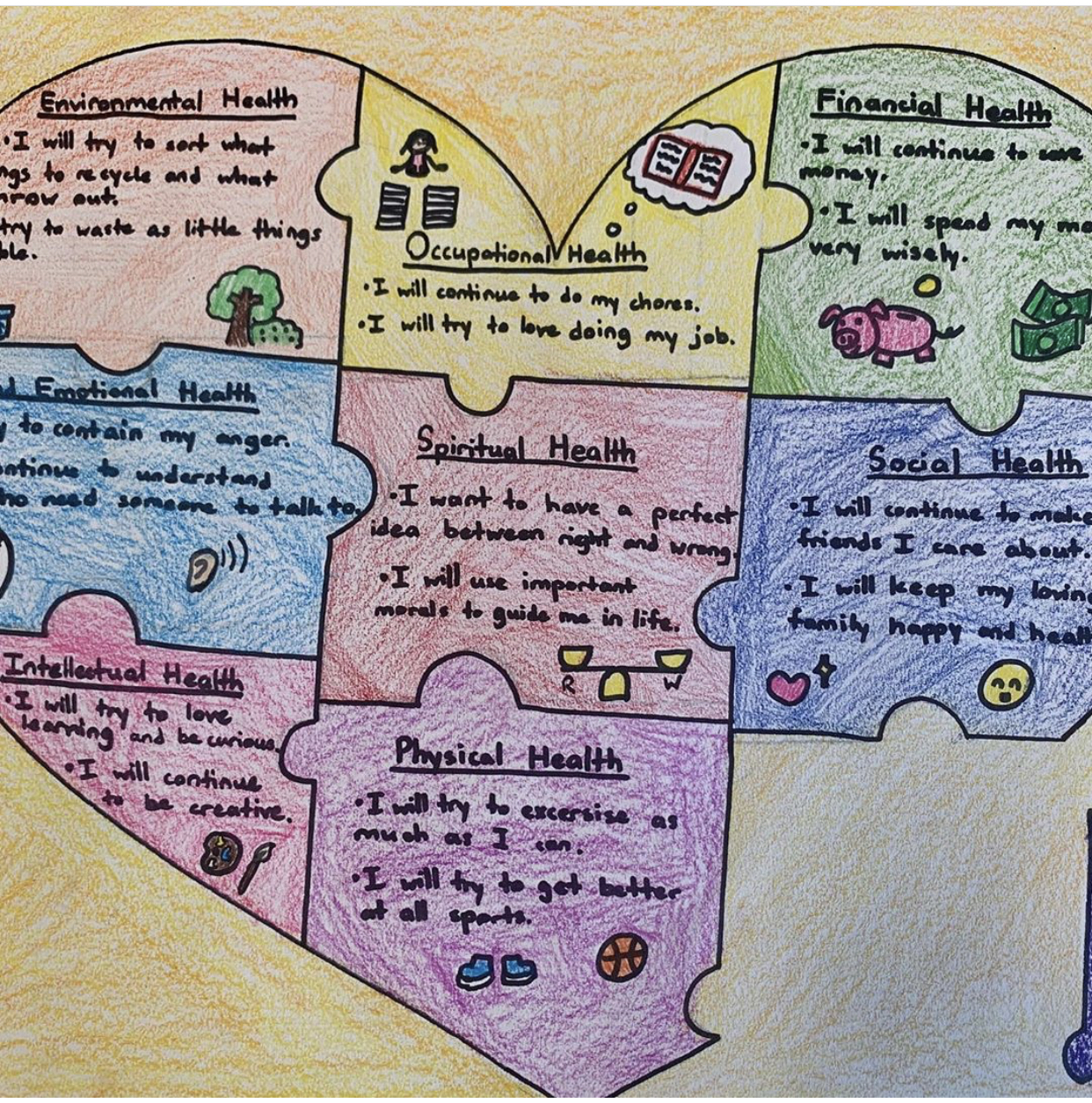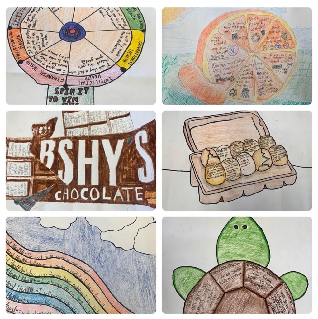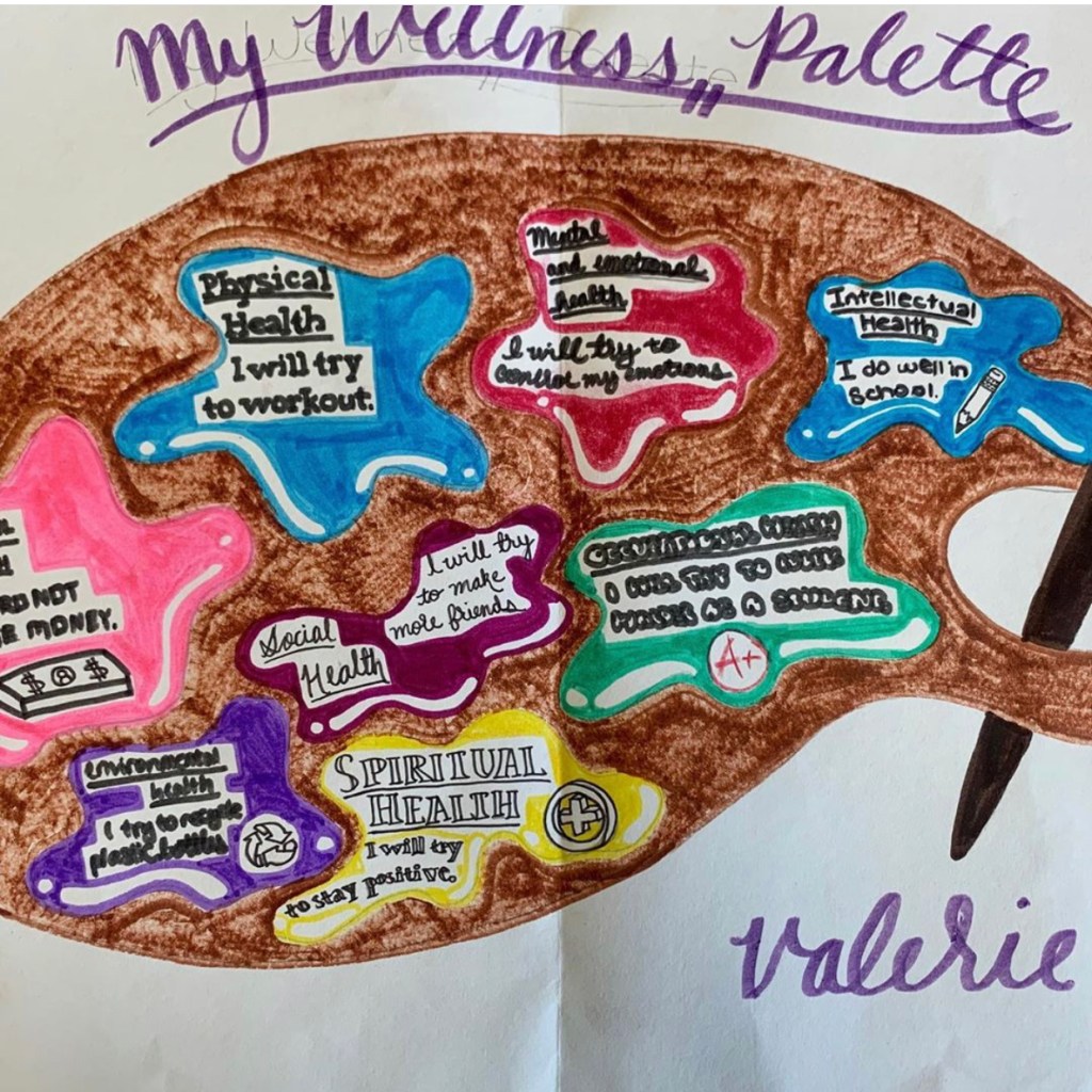 Initially, I had my students fill out the wheel on printed handouts. I had them take a look at what they do well in each particular area, as well as what they needed to improve upon in order to have healthy futures. One semester, I decided to have them use the handout as a draft and then turn it into an art project. I have so many students who love to draw, so they were all over this suggestion. The students who either didn’t like to, or couldn’t draw, asked if they could create their wheels on the computer. One student asked if the wheel had to be round, and I asked what shape she would rather it be, and she said, “how about a flower or a heart?” So I told her to have at it, and a new take on the Wellness Wheel was born. Every year I look forward to this project and the artistic creations my students come up with. They are setting goals and making positive life changes, while at the same time, having fun.
