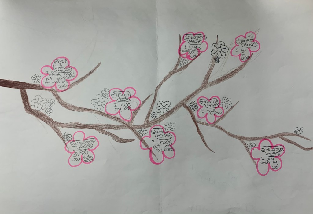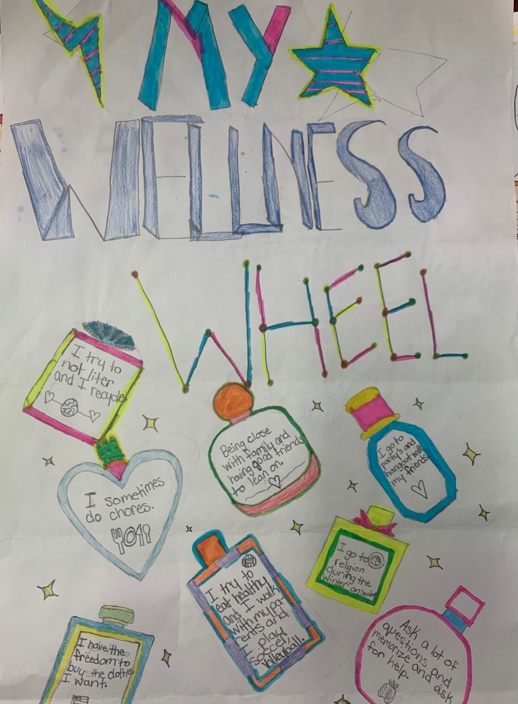 A few years ago, when I was revamping my sixth grade health curriculum, I was looking for and creating lessons that were skills and project-based. I stumbled across Janelle Kay’s Project School Wellness curriculum and was instantly excited to incorporate her lessons into my teaching. The Wellness Wheel activity is available for free on her website. How cool is that? The goal is to help students to understand that “health is multidimensional” and that “everything is connected.” Through this activity, we want them to learn that it is important to “thrive instead of merely just surviving.” Some may say that this is a lesson for older children, but I feel that it is imperative to teach higher order thinking and get kids to have a positive growth mindset as early as possible.